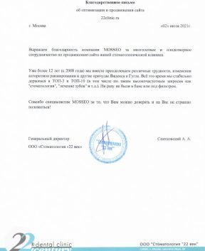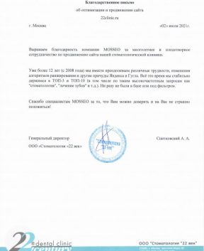 Выражаем благодарность компании MOSSEO за многолетнее и плодотворное сотрудничество по продвижению сайта нашей стоматологической клиники.