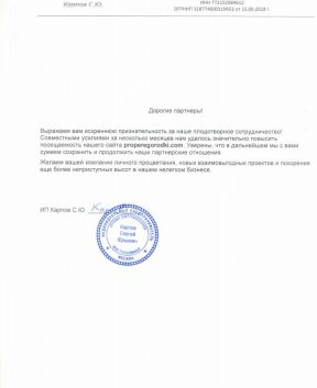 Совместными усилиями за несколько месяцев нам удалось значительно повысить посещаемость нашего сайта properegorodki.com. Уверены, что в дальнейшем мы с вами сумеем сохранить и продолжить наши партнерские отношения.