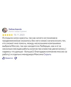 Я открыла салон красоты, так как ничего не понимаю в продвижении(как оказалось без него никак) начала искать тех, кто сможет мне помочь, между несколькими компаниями выбрала Моссео, так как находятся в Люберцах, как и я) за несколько месяцев работы количество клиентов увеличилось ) надеюсь что дальше — больше))) благодарю компанию моссео за работу) и отдельно менеджера Максима
